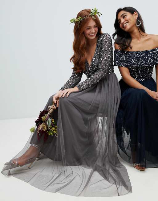 Product Name: Maya long sleeve wrap front maxi dress with delicate sequin and tulle skirt in charcoal discount