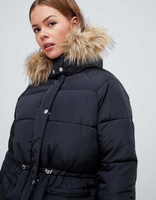 Product Name: Boohoo padded coat with fur trim and waist detail in black discount